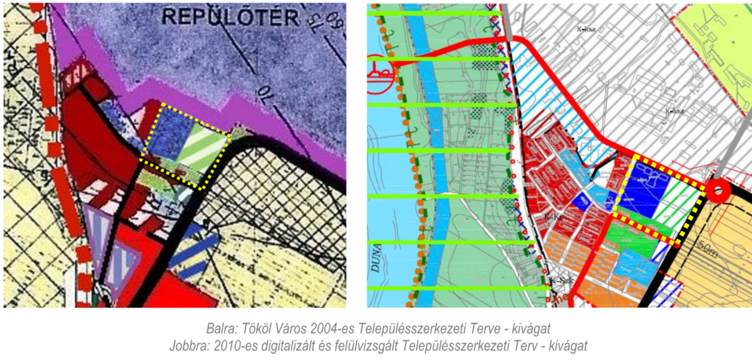 A 2004-es terv szerint a tervezési terület településközponti vegyes területbe és tervezett zöldterületbe, a Duna utca mentén meglévő zöldterületbe sorolt, a lakó rendeltetésű úszótelkek pedig kisvárosias lakóterületekként kerültek kijelölésre. A területtől északra különleges repülőtér terület, keletre korlátozott használatú mezőgazdasági terület, nyugatra pedig kisvárosias lakóterületek találhatók.