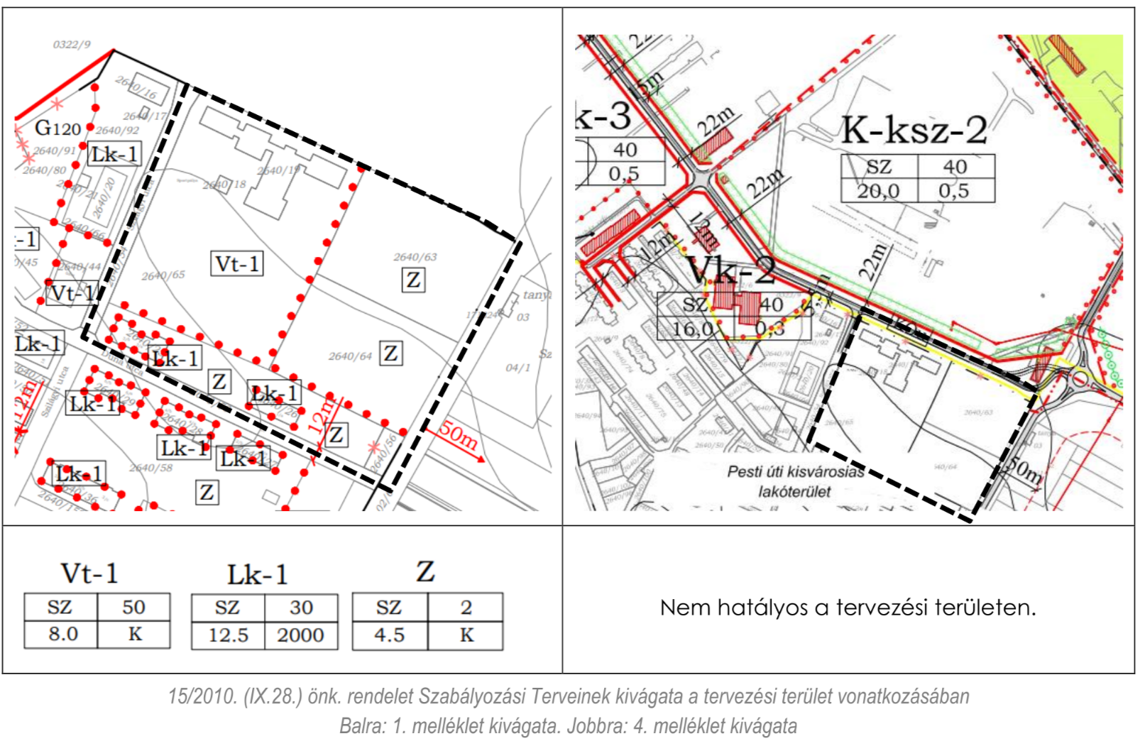 A Szabályozási Terv alapján a tervezési terület Vt-1 jelű településközponti vegyes terület építési övezetbe, Lk-1 jelű kisvárosias lakóterület építési övezetbe és Z jelű zöldterület övezetbe sorolt. A tervezési területtől északra K-ksz-2 jelű kereskedelmi, szolgáltató funkciójú különleges terület építési övezete található.