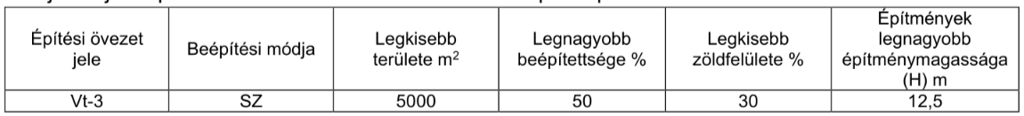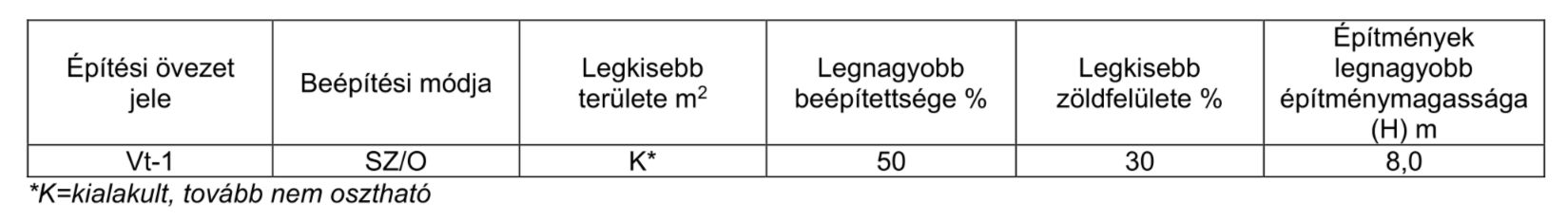 (3) A településközpont vegyes területen kialakult és kialakítható építési telkek beépítési módját, legkisebb területét, legnagyobb beépítettségét, a zöldfelület legkisebb mértékét, az építmények legnagyobb építménymagasságát és beépíthetőségét a következő táblázat figyelembevételével kell meghatározni.”