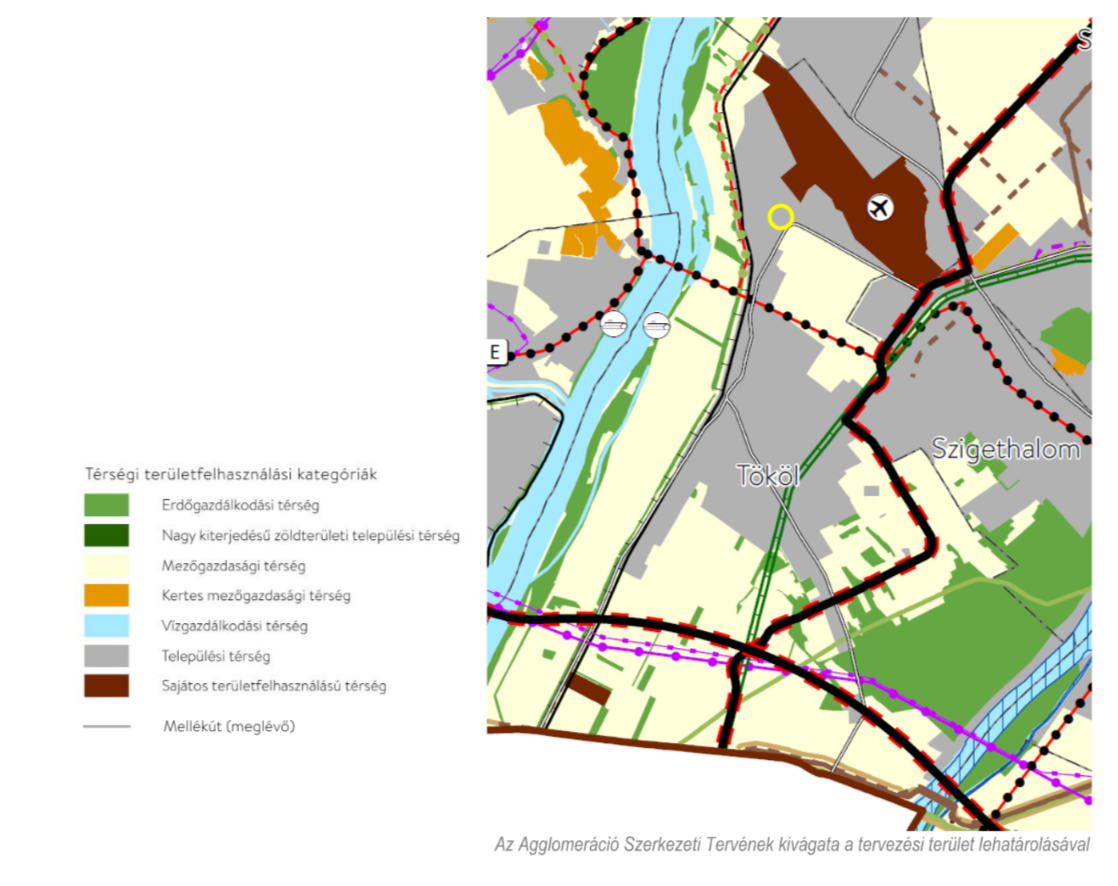 A szerkezeti terven látható, hogy a tervezési terület települési térségben helyezkedik el. A területet keletről mezőgazdasági térség veszi körül, északra pedig a sajátos területfelhasználású térséghez tartozó repülőtér területe található.