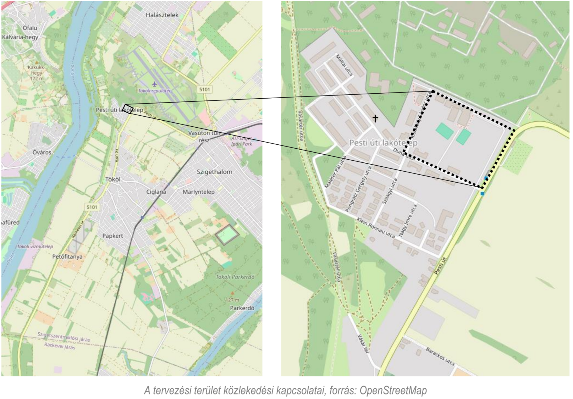 A tervezéssel érintett terület léptékének tekintetében nem várható a közeljövőben a közlekedési infrastruktúra hálózatot érintő jelentős változás. A tervezett lakó- és szolgáltatóház elérésére a kiszolgáló út mind a Duna utcához csatlakozóan kiépíthető. A kiszolgálás más alternatív módon is megoldható lenne, de a lehetséges megoldások közül a Duna utcára történő csatlakozás preferálható.