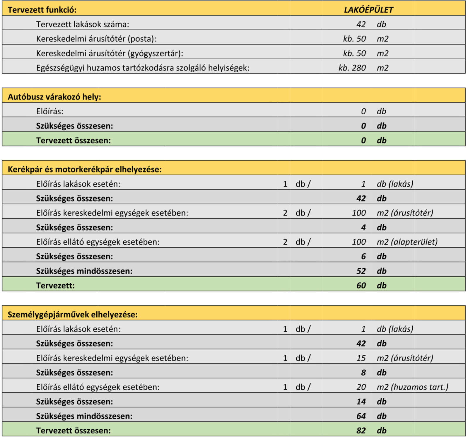 A parkolási kapacitások számítását az alábbi táblázat tartalmazza (Forrás: építészeti műleírás):