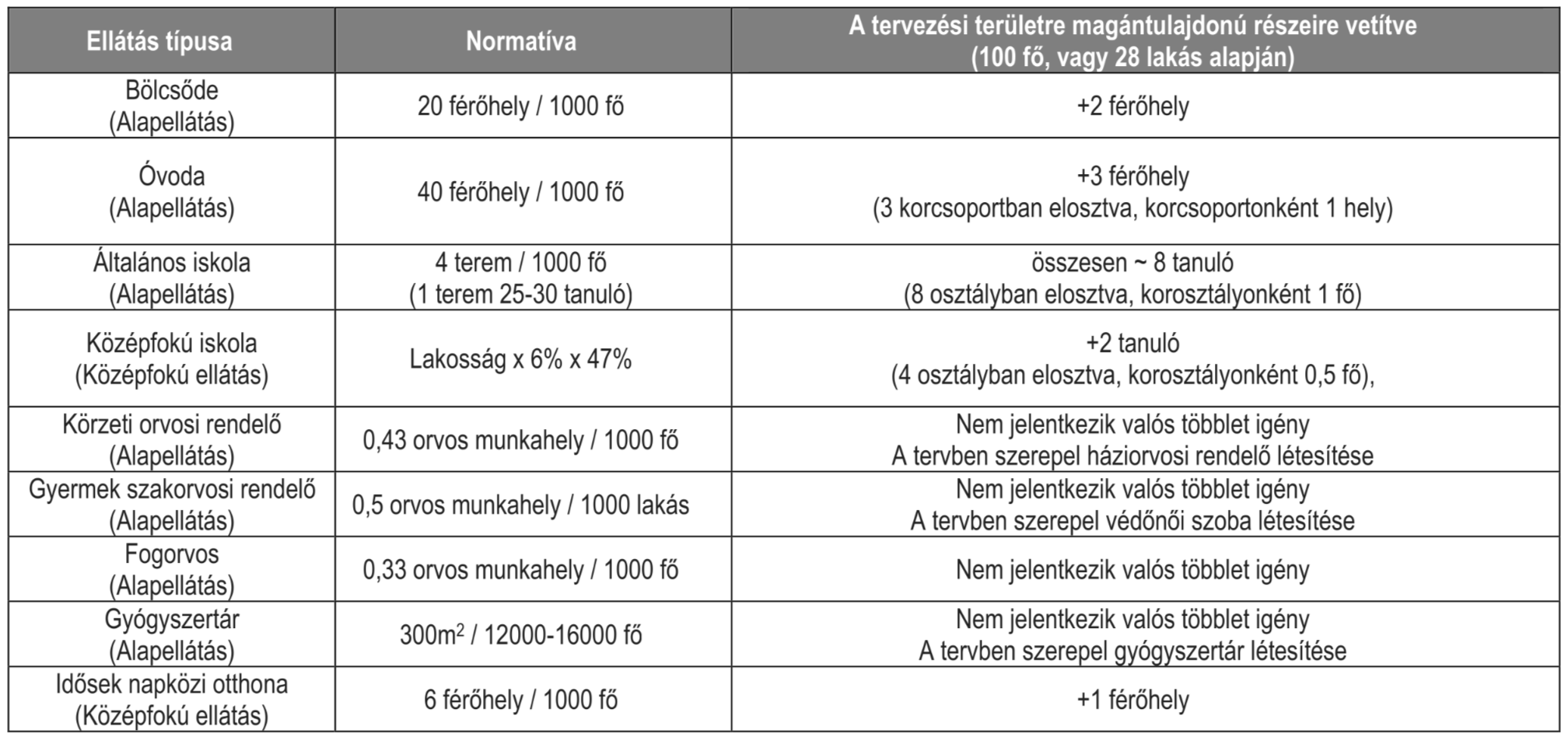 A táblázatban megjelölt alapellátással kapcsolatos többlet igények várhatóan biztosíthatók a területen található általános iskola, óvoda és bölcsőde intézményeiben, ugyanis ezek nem teljes kihasználtsággal működnek jelenleg. Kiemeljük, hogy a táblázat becsléseket és abból is a lehetséges maximumokat tartalmazza. Az összes igény nem feltétlenül ekkora mértékben és nem feltétlenül egyszerre jelentkezhet a területen.